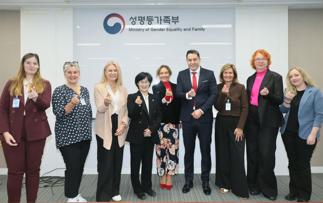[시사투데이 = 이한별 기자] 원민경 성평등가족부 장관(가운데 왼쪽)이 리나 갈베즈 유럽의회 여성인권성평등위원회위원장(가운데 오른쪽)과 함께 31일 오전 정부서울청사에서 유럽의회 여성인권성평등위원회 방한의원단 면담을 마치고 기념촬영을 하고 있다.