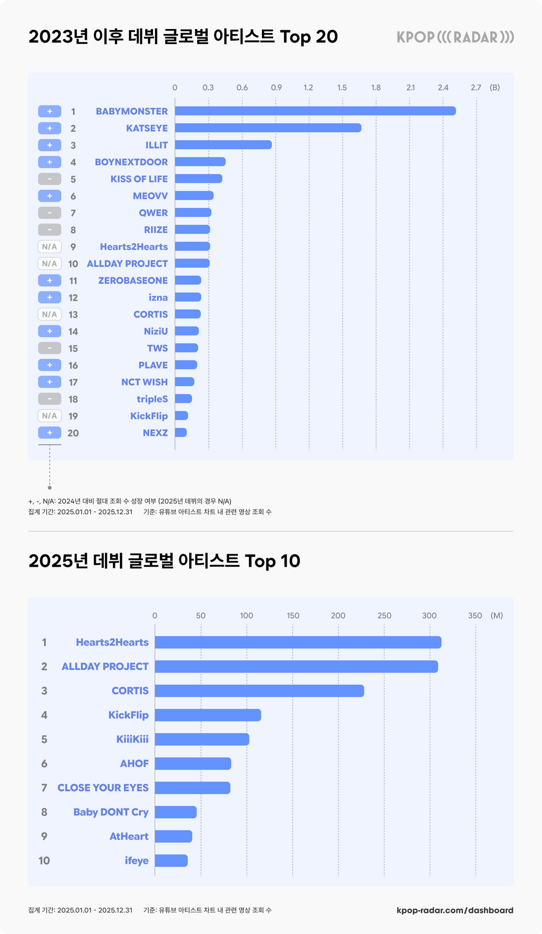 2025년 데뷔 아티스트 Top 10에서는 하츠투하츠가 약 3.1억 뷰로 1위를 기록했으며, 올데이 프로젝트와 코르티스가 그 뒤를 이었다. 이와 함께 킥플립, 키키, 아홉, 클로즈 유어 아이즈 등은 1억 뷰 안팎의 조회 수로 촘촘한 순위를 형성하며 경쟁 구도를 만들었다. 이는 대형 그룹의 독주보다는 중소 기획사와 다양한 콘셉트의 팀들이 공존하며 경쟁하는 흐름이 강화되고 있음을 보여준다.