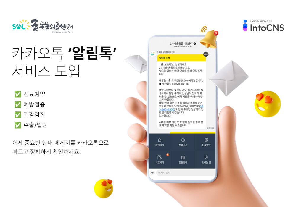 그동안 병원에서는 보호자들에게 진료 예약, 수술 일정, 처방 안내 등을 문자메시지(SMS)로 전달해왔다. 하지만 문자 길이 제한, 스팸 문자 인식, 접근성 문제 등으로 보호자들이 필요한 정보를 제때 확인하지 못하는 경우가 발생했다.