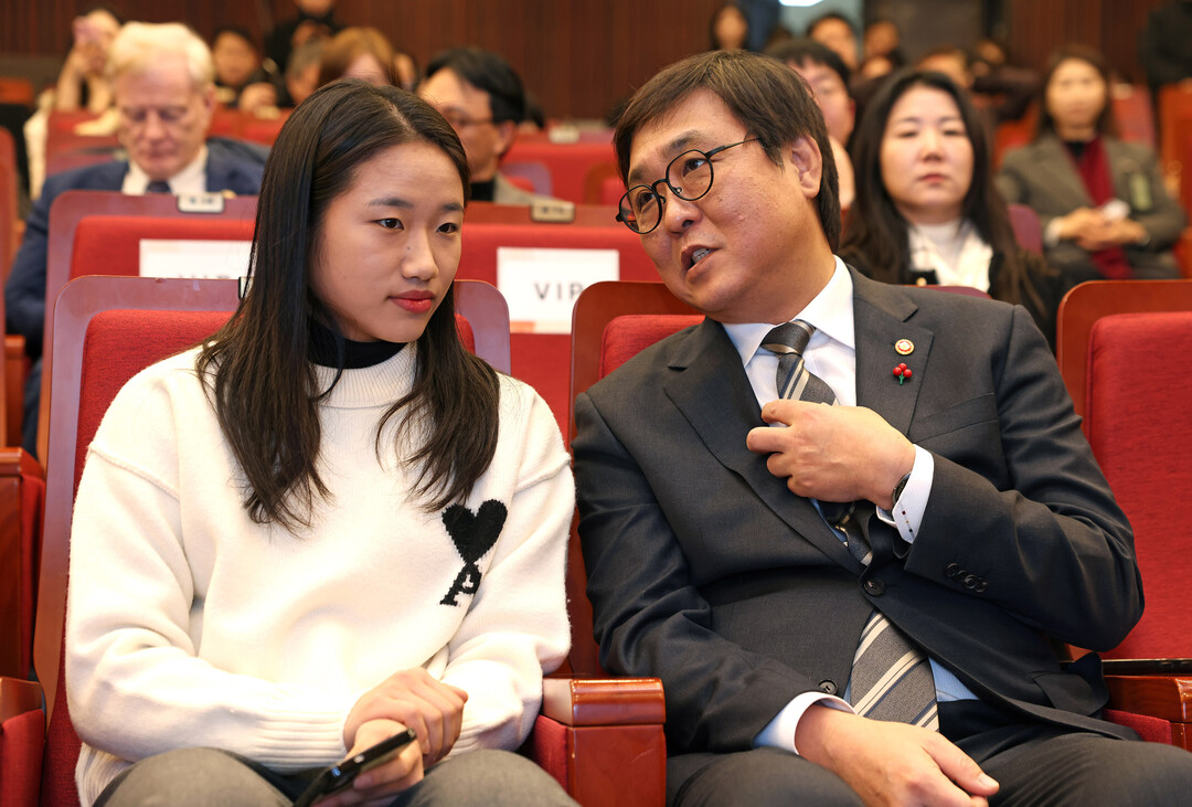 [시사투데이 = 이지혜 기자] 최휘영 문화체육관광부 장관이 30일 서울 영등포구 국회도서관 대강당에서 열린 2025 국가브랜드 컨퍼런스에서 국가브랜드대상 글로벌 스포츠 리더십 부문을 수상한 배드민턴 안세영 선수와 이야기를 나누고 있다.