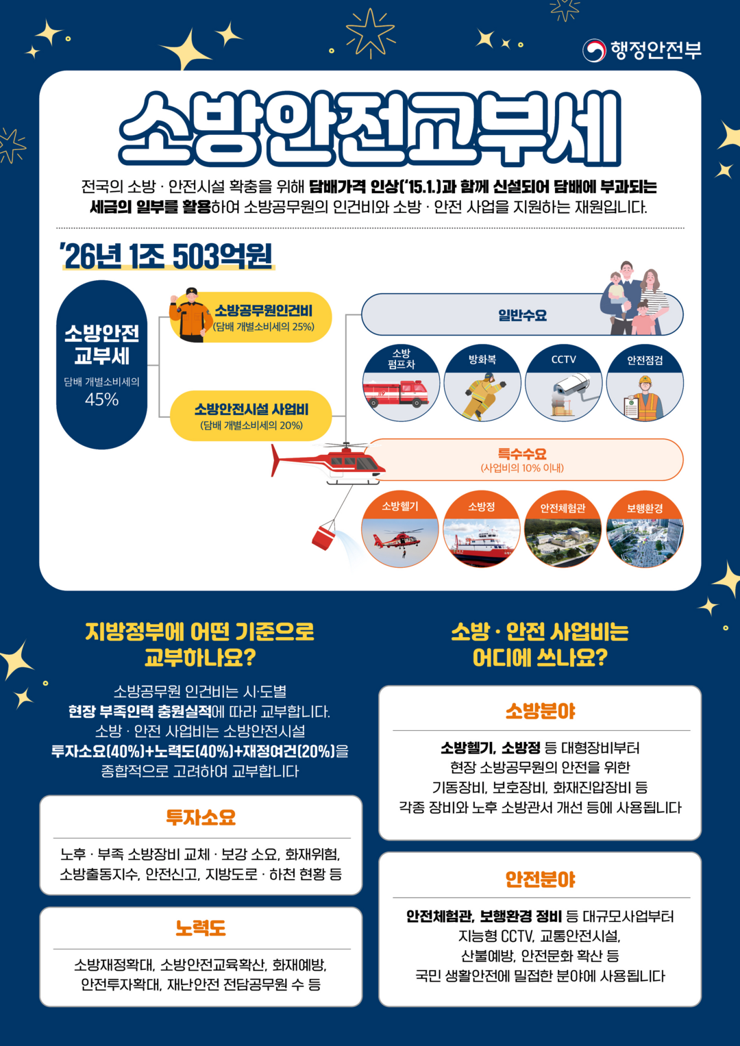 행정안전부는 지방정부의 소방 및 안전시설 확충 등을 지원하기 위해 내년소방안전교부세 1조 503억 원을 17개 시·도에 교부한다고 밝혔다.