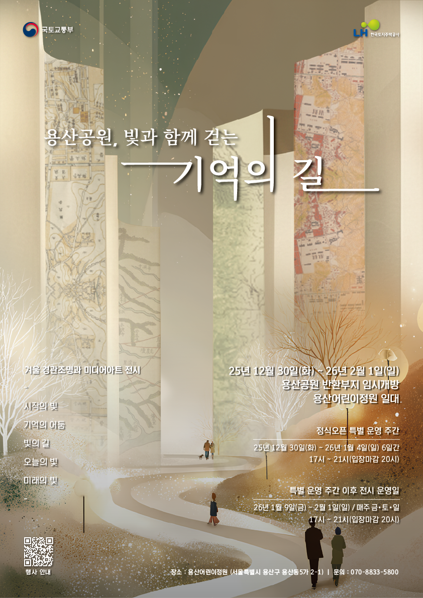 한편, 30일부터 2월 1일까지 야간 운영을 시작한다. 매주 금~일 오후 5시부터 9시 용산어린이정원 장군숙소 인근에서 ‘용산공원, 빛과 함께 걷는 기억의 길’ 프로그램을 운영한다.
