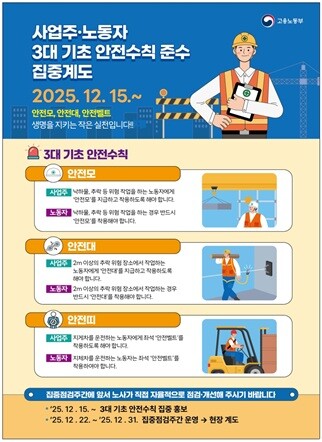 이번 점검에는 지방노동관서장, 근로감독관, 한국산업안전보건공단 관계자가 건설현장의 사업주와 노동자를 대상으로 3대 기초 안전수칙 준수 여부를 점검하고 미흡한 사항은 즉시 개선토록 할 방침이다.