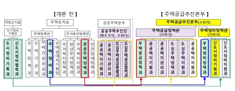 신설되는 주택공급추진본부는 주택공급 정책의 책임성과 일관성을 강화하기 위해 기존 국장급 공공주택추진단을 실장급 조직으로 격상하는 한편, 흩어져 있던 주택공급 관련기능을 집적했다.