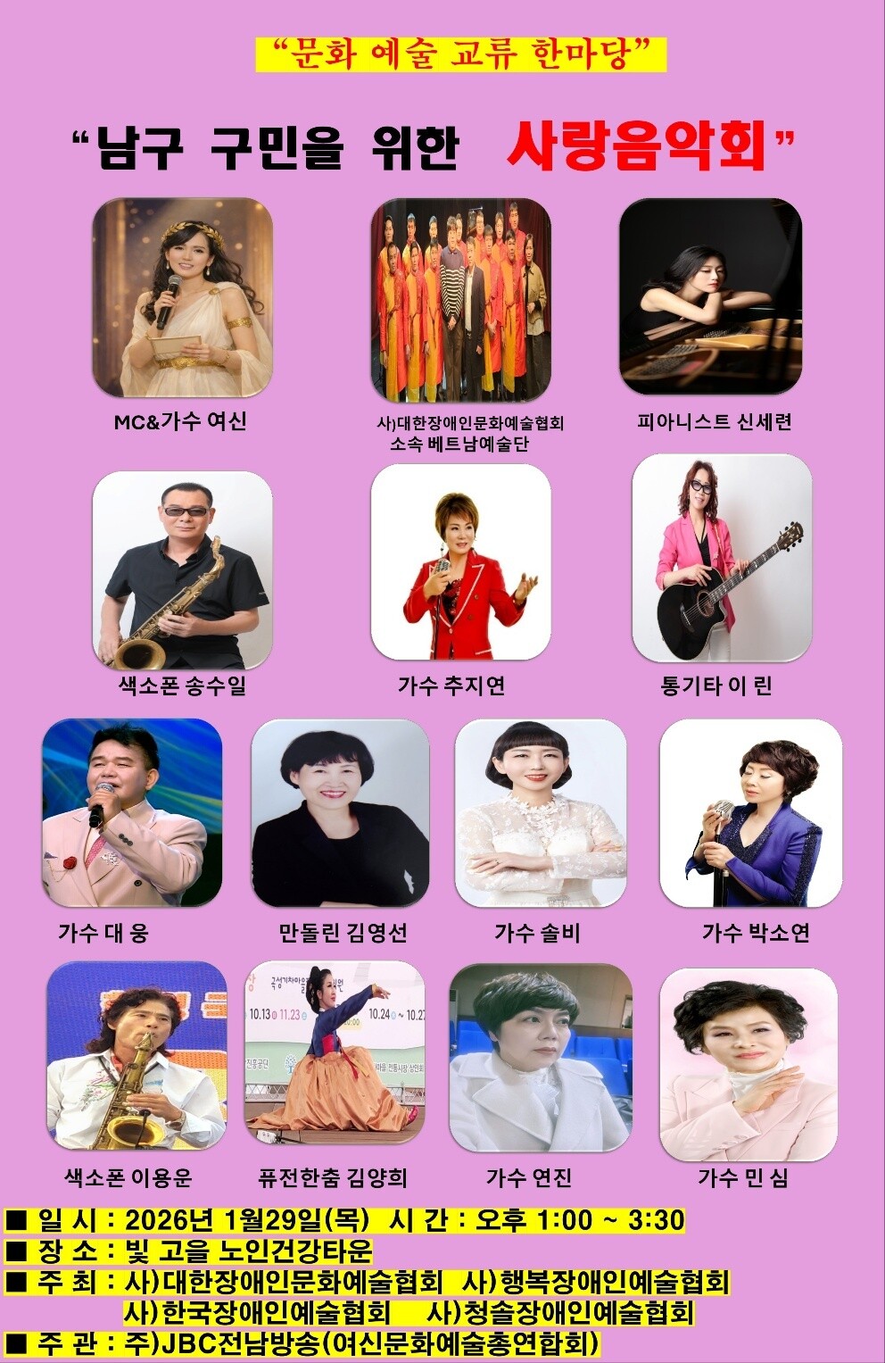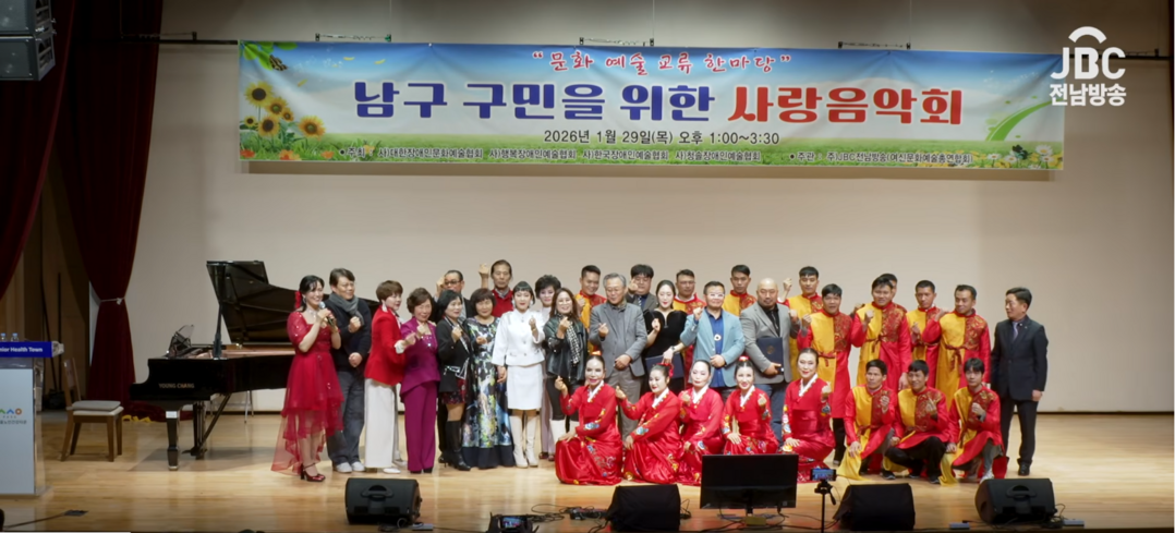 남구민과 지역민 등 300여명이 함께한 이번 '사랑음악회는 JBC전남방송과 여신문화예술총연합회가 주관, (사)한국장애인예술협회, (사)대한장애인문화예술협회, (사)행복장애인예술협회, (사)청솔장애인예술협회가 주최했다.