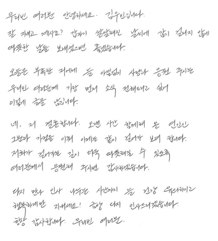 김우빈 역시 이날 자신의 팬카페에 자필 편지를 올리며 직접 결혼 소식을 전했다.