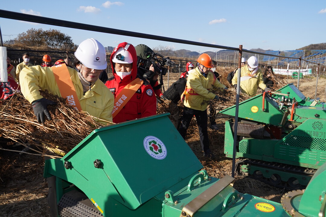 [시사투데이 = 이한별 기자] 송미령 농림축산식품부장관(왼쪽에서 첫번째)과 김인호 산림청장(가운데)이 3일 경북 안동시 임하면에서 영농부산물 파쇄 작업을 하고 있다. <사진=산림청 제공>