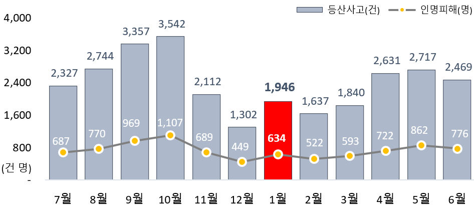다만 1월에는 새해를 맞아 새로운 희망과 각오를 다지기 위해 산에 오르는 사람이 늘면서 겨울철 중 가장 많은 1,946건의 등산사고와 634명의 인명피해가 발생했다.