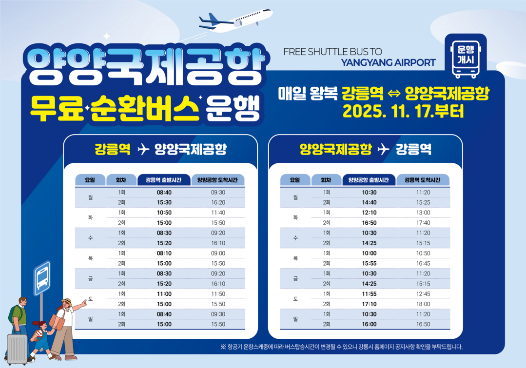 강릉역과 양양공항의 요일별 순환버스 탑승시간 및 승·하차장은 강릉시 홈페이지에서 확인 가능하다. 최근 양양국제공항 정기노선 취항을 시작한 파라타 항공의 출·도착 시간대에 맞춰 실질적인 환승 편의성을 높이는 방향으로 편성됐다.