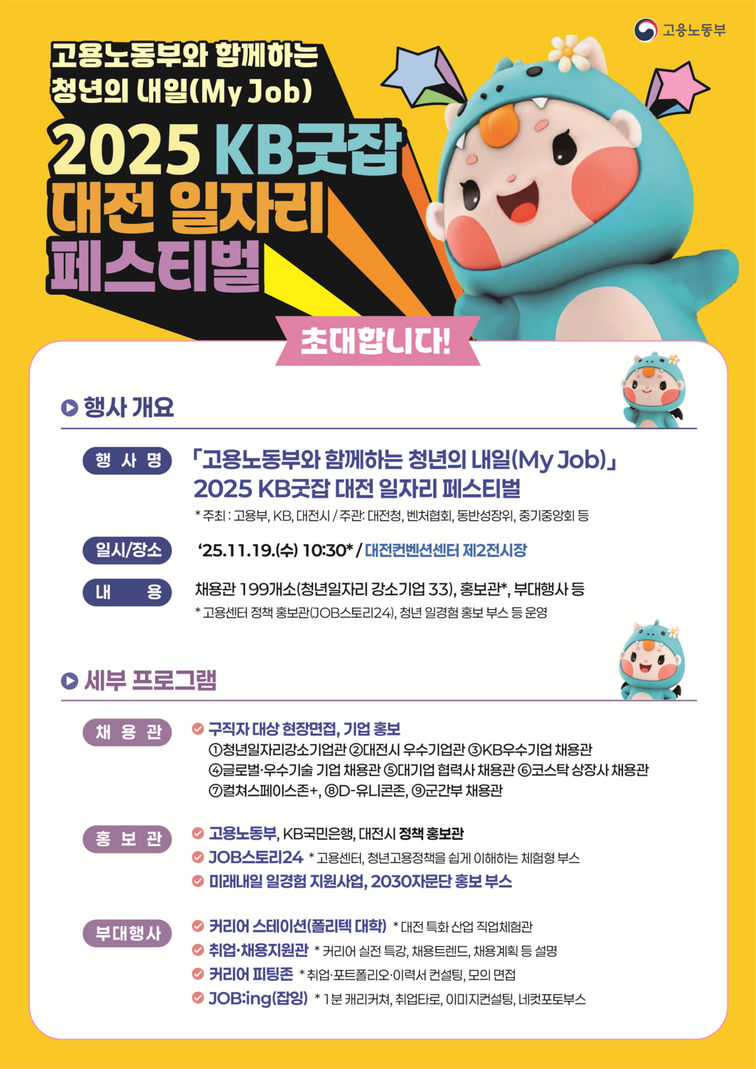 고용노동부와 KB국민은행, 대전광역시가 공동 주최하는 ‘고용노동부와 함께하는 청년의 내일(My Job), 2025 KB굿잡 대전 일자리 페스티벌’이 19일 대전컨벤션센터 제2전시장에서 열린다.