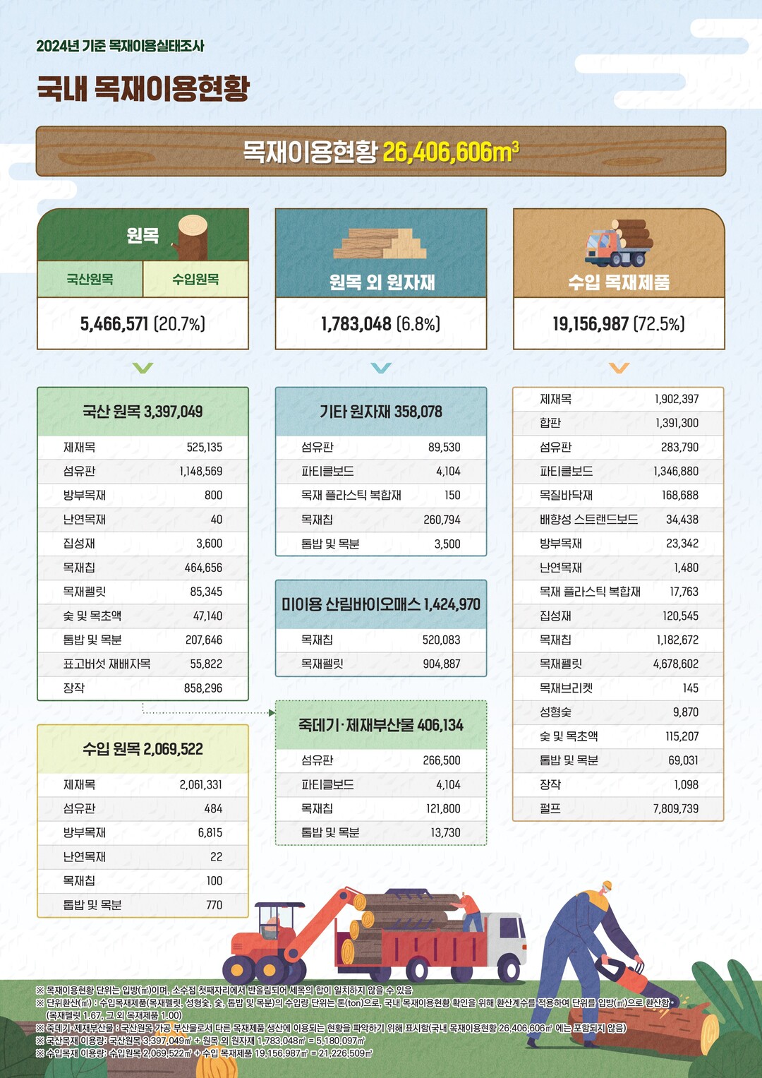 지난해 전체 목재이용량은 2023년 2722만㎥보다 약 81만㎥ 감소했다. 수입목재 이용량(2123만㎥)은 2023년 2192만㎥ 대비 69만㎥, 국산목재 이용량(518만㎥)은 2023년 531만㎥ 대비 13만㎥ 감소했다.