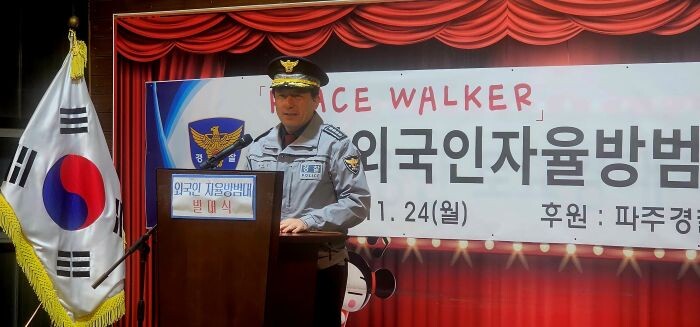 정덕진 파주경찰서장은 이날 광탄(피스워커)외국인자율방범대 출범식에 참석해 축사를 통해 "외국인 자율방범대원들의 적극적 협조에 감사드린다"면서 "앞으로도 지역 주민들의 평온한 치안 확보와 외국인들의 안전을 위해 최선을 다하겠다"고 말했다.