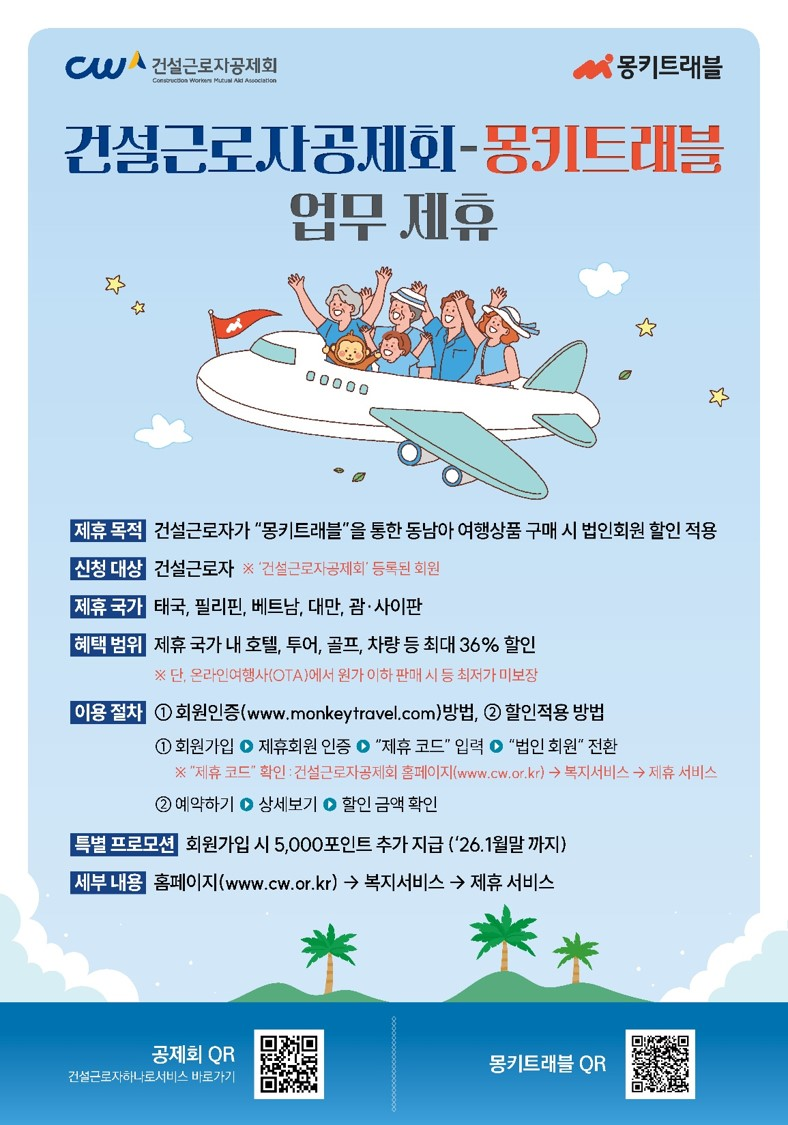 이번 협약을 통해 공제회에 가입된 건설근로자는 몽키트래블의 법인회원으로 등록돼 동남아 지역(태국, 필리핀, 베트남, 대만, 괌·사이판) 내 호텔, 투어, 골프, 차량 이용 시 최대 36% 할인된 요금으로 서비스를 이용할 수 있다.