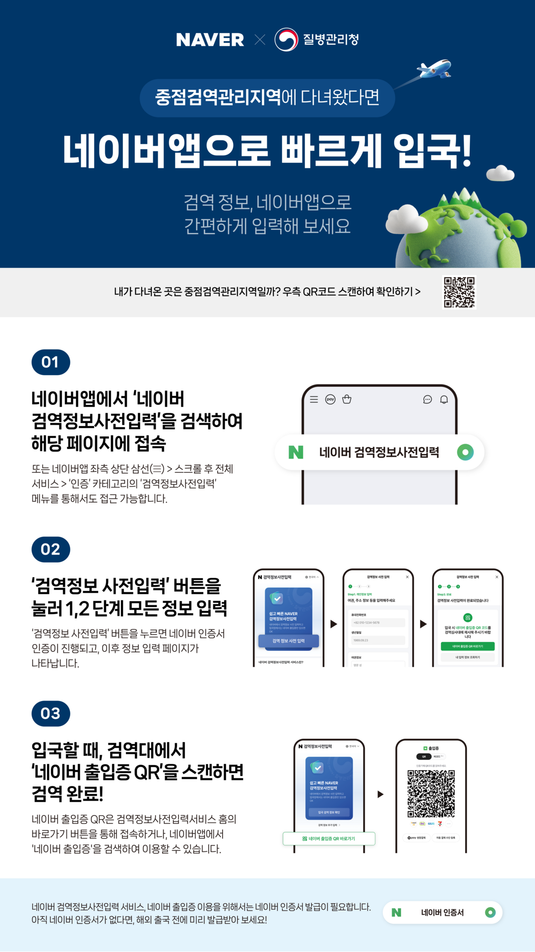 해당 서비스는 네이버에서 ‘네이버 검역정보사전입력’을 검색하거나 네이버앱 메뉴를 통해 바로 이용할 수 있다. 기존 질병관리청의 Q-CODE 누리집에서도 접속 링크를 제공하고 있다.