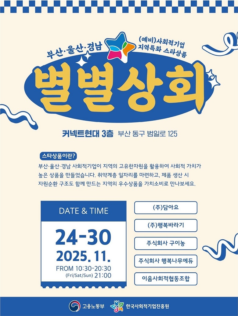 [시사투데이 = 이윤재 기자] 부산·울산·경남 사회적기업 스타상품이 24일부터 일주일간 커넥트 현대 부산 3층에서 소비자를 만난다.