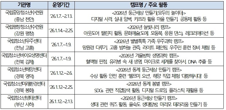 국립중앙청소년수련원은 디지털·문화예술·팀워크 활동을 결합한 ‘둥근세상 만들기(모두의 놀이터)’ 프로그램을 운영한다. 국립평창청소년수련원은 ‘2026년 늘빛나리 캠프’를 통해 문화 활동과 모험 활동을 접목한 종합형 청소년활동을 제공한다.