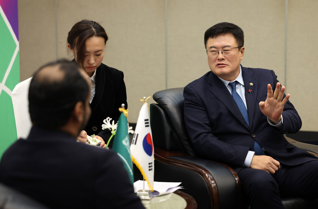 [시사투데이 = 이윤지 기자] 압둘아지즈 알마사이드 사우디아라비아 스포츠부 차관이 4일 부산 해운대구 벡스코에서 김대현 문화체육관광부 제2차관과 면담을 하고 있다.