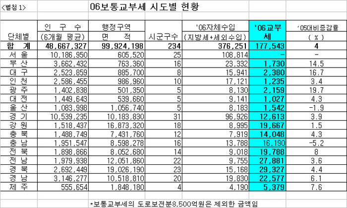 77개 市중에서 불교부단체는 수원, 안양, 안산, 성남, 부천, 과천, 용인, 고양, 화성(신규)이고 나머지 68개 市는 평균 987억원, 88개 郡은 평균 840억원으로 나타났다.