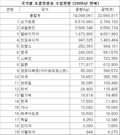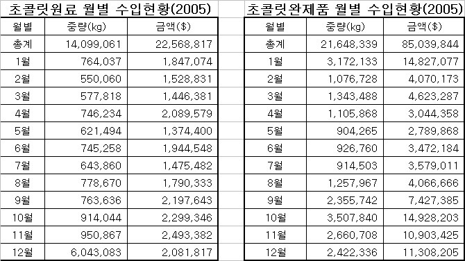 * 참고자료(이미지 침조) : 1. 국가별 초콜릿완제품 및 원료 2005수입현황