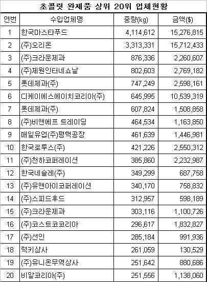 3. 쵸코릿 완제품 상위 20위 업체현황