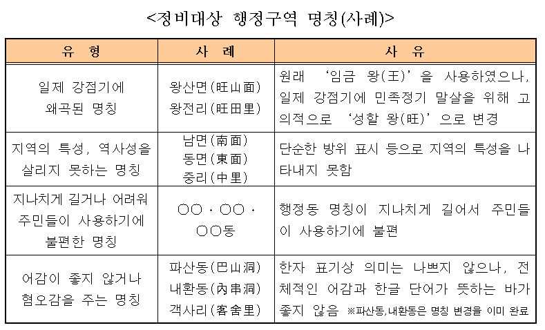 정부는 일제 강점기에 왜곡되거나 주민이 사용하기에 불편한 행정구역 명칭의 일제 정비를 추진하기로 했다. 일제는 1914년 행정구역을 개편하면서 우리의 민족정신을 말살하기 위하여 고유의 행정구역 명칭을 일본식으로 개조하는 작업을 대대적으로 단행했으며 이후로도 고유 명칭을 일본식으로 왜곡한 바 있다.