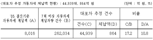 이에 따라 행정자치부는 관계부처와 협의하여 고질, 상습 자동차세 체납차량 중 자동차 등록원부상 명의자와 실제 점유, 사용자가 다른 대포차의 명단을 주민전산망 등을 연계하여 45천대를 파악하여 시·도에 통보 조치하였다.