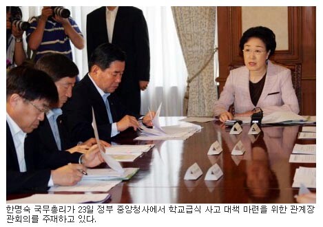 지난 23일 사회문화조정관실에서는 식중독 관련 긴급장관회의를 소집했다. 이 회의에서는 한명숙 국무총리가 주재를 했고 김진표 교육부총리, 박흥수 농림장관, 유시민 복지, 김성진 해수부 장관, 문창진 식약청장 등이 참석했다.