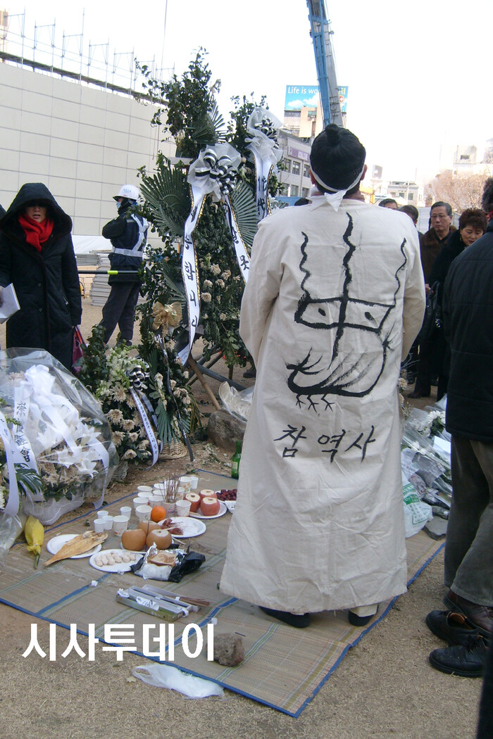2월 13일 오후, 화재가 일어난 지 4일째인 숭례문(남대문) 화재현장에는 문화재청이 현장감식과 복원작업을 위해 쳐놓은 가림막 설치공사가 한창이다.