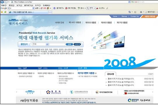 이번에 서비스하는 웹 기록은 최초 인터넷 웹 사이트가 개설된 제14대 김영삼 대통령부터 제15대 김대중 대통령, 제16대 노무현 대통령 재직 시 청와대 및 자문기관 그리고 제17대 대통령직인수위원회 홈페이지가 포함된다.
