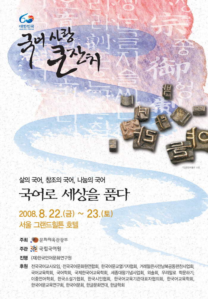 건국 60주년 기념 국어의 과거를 돌아보고 앞날의 국어 정책방향을 내다보는 ‘국어사랑 큰 잔치’가 8월 22일, 23일 양일간 홍은동 그랜드힐튼 호텔에서 개최된다.
