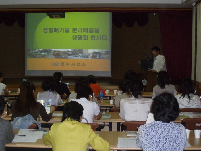 이날 교육은 환경보존의 중요성, 생활쓰레기 및 재활용 분리배출 방법 등에 대해서 클린사업소 이기용 소장이 직접 강의를 했다.
