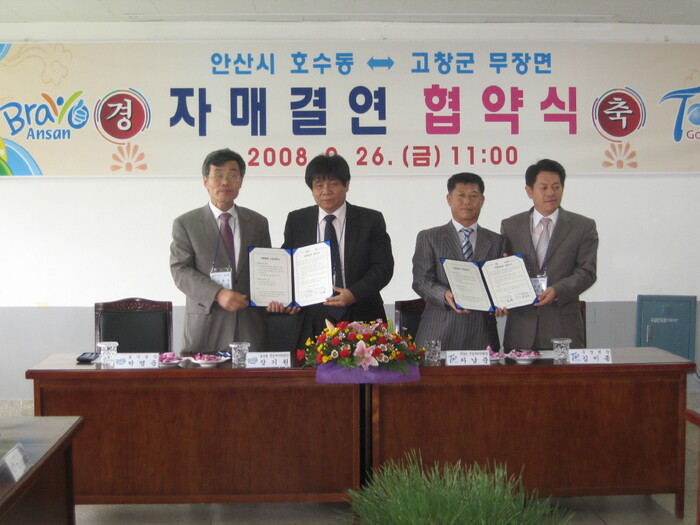 안산시 단원구 호수동(동장 박영운)과 전북 고창군 무장면(면장 김이종)이 지난 26일 무장면사무소에서 자매결연을 맺고 상호 발전을 위한 협력을 다짐했다.
