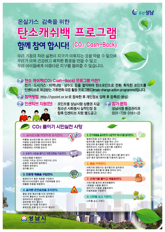 ‘탄소 캐쉬백 제도’는 각 가정에서 전기나 상수도 등을 절약하면 그 절약한 에너지량을 탄소 포인트로 환산해 매년 말 누적된 포인트 점수 별로 성남사랑 상품권을 지급하거나 청소년 자원봉사 시간으로 인정해주는 등의 각종 인센티브를 지원하는 온실가스 감축을 위한 시민실천방안 프로그램이다.