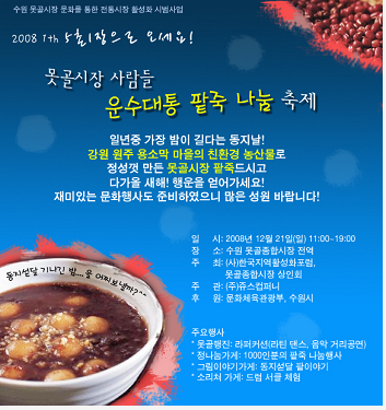 못골시장은 소비자에게 싱싱하고 건강한 제철 농산물을 맛볼 수 있는 기회를 제공하고 문화축제를 통해 지역주민을 모으고자 친환경 농산물로 만든 동지 팥죽을 수원 시민과 나눠 먹는 행사를 진행한다.