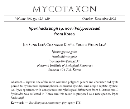 신종 기계충버섯은 경상북도 문경새재에서 채집된 것으로, 목재부후균의 연구에 공헌을 한 서울대 정학성 교수의 이름이 붙여졌다. ‘Irpex hacksungii’로 불리게 되어 해외 유명저널 ‘Mycotaxon’ 10-12월호에 발표됐다.
