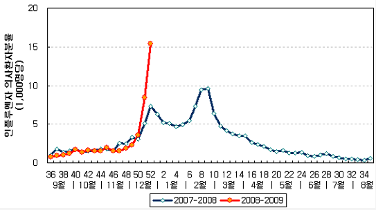 2008년 12월 13일 이후 서울, 부산, 대구, 인천, 광주, 울산 등 대도시에서 인플루엔자 의사환자분율이 크게 증가했고 대부분의 지역에서 계속적인 증가 추세를 나타내고 있다.