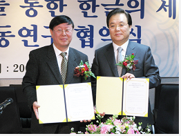 국립국어원 이상규 원장과 YTN 구본홍 사장이 8일 YTN에서 한글 세계화를 위해 함께 노력할 것을 합의하는 공동 연구 협약서에 서명했다.