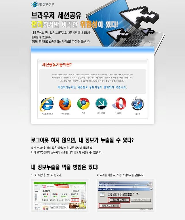 요즘 출시되는 웹 브라우저들의 세션공유로 인터넷 사용은 편리해졌지만 사소한 부주의로 소중한 개인 프라이버시가 침해 될 수 있어 '웹 브라우저 Logout 운동'을 전개한다고 행안부는 밝혔다. 세션이 공유되는 브라우저 사용 시 PC사용이 끝난 후 '로그아웃'을 실행하거나 모든 윈도우 창을 닫아야 하지만 많은 네티즌이 이 부분을 모르고 있어 대국민 홍보차원에서 이번 운동을 추진한다고 했다.