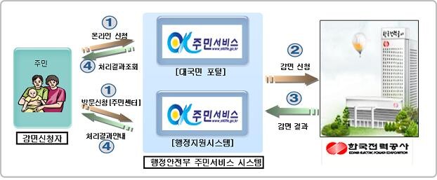 기존의 전기요금 감면 신청은 기초생활수급자, 장애인, 국가 유공자 등 감면 대상자 본인이 직접 한국전력을 방문해 증빙서류를 제출하고 업무 담당자가 행정망을 이용해 자격자 여부를 확인하는 불편함이 있었으나 주민서비스 통합정보시스템을 이용해 신청하면 전기요금 감면 수혜자격 여부를 본인이 직접 실시간으로 확인할 수 있고 신청 다음날부터 감면 혜택을 받을 수 있다.