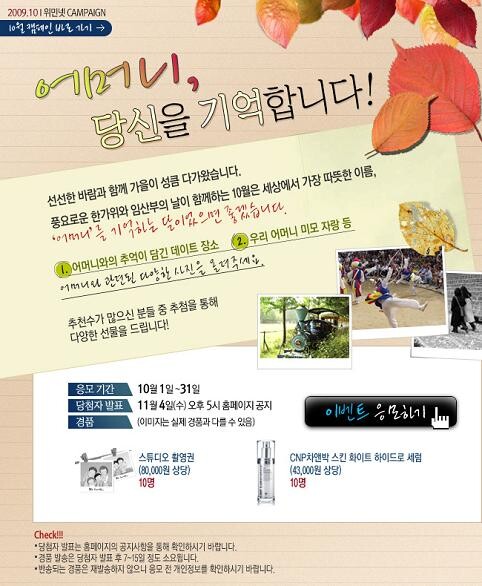 아울러 위민넷은 캠페인에 참여하는 시민들을 대상으로 '어머니, 당신을 기억합니다' 이벤트도 함께 실시한다. 어머니와 추억이 담긴 데이트 장소, 우리 어머니 미모 자랑 등 어머니와 관련된 다양한 사진을 올리면 추천수가 많은 회원 중 추첨을 통해 스튜디오 촬영권, 여성용 화장품 등 다양한 경품을 제공할 계획이다. 응모는 10월 한 달 간 위민넷 사이트(www.women.go.kr)를 통해 이뤄지며 발표는 11월 4일이다.
