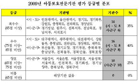 지난 5월부터 9월까지 실시된 '아동보호전문기관 평가결과'를 어제 7일 복지부가 발표했다. 금년은 아동보호전문기관이 설치된지 9년째 되는 해로 아동학대 예방사업의 성과를 점검하고 보다 강화된 예방사업을 추진하기 위한 개선방안을 마련하고자 평가를 시행했다. 평가대상 아동보호전문기관은 지방자치단체가 지정·운영하는 지역아동보호전문기관으로 시·도 설치 16개소 및 시·군·구 설치 24개소, 총 40개 기관이다. 이번 평가는 조직, 인력, 서비스, 교육·홍보 및 대외협력 등 4개 영역에 걸쳐 실시했으며 평가 결과 평점 65점 미만에 해당하는 미흡등급을 받은 기관은 없었고 전반적으로 우수한 것으로 나타났다. 평점 85점 이상인 최우수등급을 받은 기관은 전체 40개 중 14개 기관(35%)으로 나타났으며 시·도 기관 16개 중 8개 기관(50%), 시·군·구 기관 24개 중 6개 기관(25%)이다.