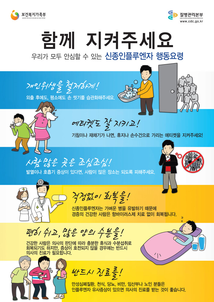 질병관리본부 중앙방역대책본부(본부장 이종구)는 보건소에서 시행중인 계절인플루엔자 무료접종과 관련해 65세 이상 노인과 사회복지시설 생활자에 대한 물량을 확보해 실시하고 있으며 접종 대상자에게 정해진 시기를 통보해 대기 시간을 최소화하고 있다고 밝혔다. 이에 따라 65세 노인분들은 아침 이른 시간부터 대기하거나 몸이 안 좋은 상태에서 무리하게 접종을 받지 말고 건강한 상태에서 접종받도록 당부했다. 또한 계절 인플루엔자 백신을 맞는다고 신종 인플루엔자가 예방되는 것은 아니라고 덧붙였다.