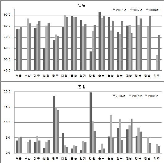높을수록 좋은 지역별 입원율(70.8%~89.0%)은 충북(89.0%), 경남(88.7%), 울산(88.0%), 대전(87.9%) 순인 반면 낮을수록 좋은 지역별 전원율(1.4%∼14.0%)은 광주(14.0%), 전남(11.2%)이 타 지역에 비해 높았다.