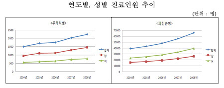 성별 실진료환자수는 '08년을 기준으로 루게릭병의 경우 남성 1,460명, 여성 784명으로 남성이 1.9배 많았으며 파킨슨병은 남성 26,272명, 여성 39,673명으로 여성이 1.5배 많은 것으로 나타났다.