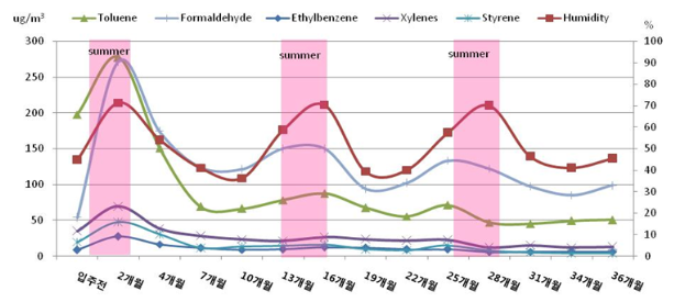 입주 후 2개월부터 36개월까지는 폼알데하이드(132.6 μg/m3), 톨루엔(85.9 μg/m3), 아세톤(68.8 μg/m3), 자일렌(25.3 μg/m3) 순으로 검출됐다.