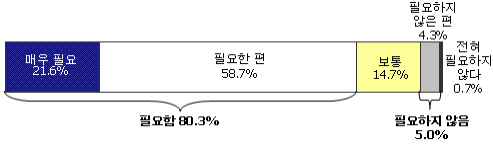 특히 보행자 권리를 우선시하는 법안이 필요하다고 생각하는가에 대한 질문에는 전체 응답자 5명 중 4명 이상(80.3%)이 필요하다고 응답해 보행자 권리에 대한 제도적 장치가 필요하다는 인식이 매우 높게 나타났다.