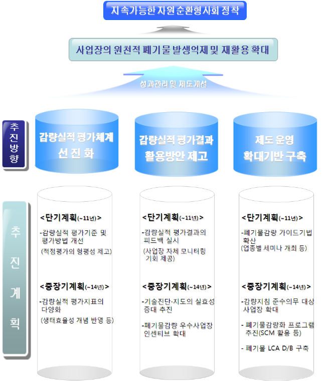 단기적으로는 기존의 평가방법 개선과 사업장폐기물 감량 가이드를 보완하고 우수사업장 사례를 적극 발굴해 보급‧홍보하는 등 제도의 현실성을 높이고 중‧장기적으로는 생태효율성(Eco-efficiency) 개념 도입 및 폐기물 전과정평가(LCA,life cycle assessment) D/B를 구축하는 등 감량화제도 시스템의 선진화를 추진할 계획이다.