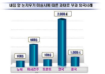내집·점포앞 눈치우기 주민참여 활성화를 위해 근거 법령인 자연재해대책법 벌칙조항 신설과 자치단체 조례에 과태료(100만원이하) 등을 부과할 수 있는 규정을 마련, 공동체의식을 함양키로 했다.