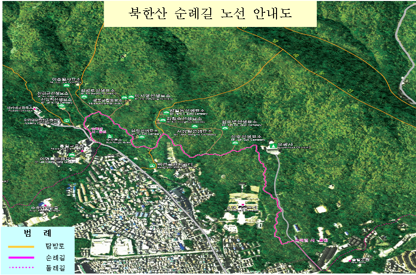 북한산둘레길 중 이번에 개방되는 구간은 성재 이시형선생 등 16기의 독립유공자묘역이 있는 곳과 우이동 솔밭공원을 연결시킨 구간으로 독립유공자들의 애국심을 고취시키고자 ‘순례길’이라고 명명되어진 3.4km구간이다.