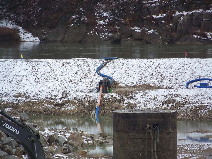 그리고 강천보 공사 현장에서 하류 500 미터 지점에서는 준설을 위해 강을 가로막는 공사가 진행 중에 있다.